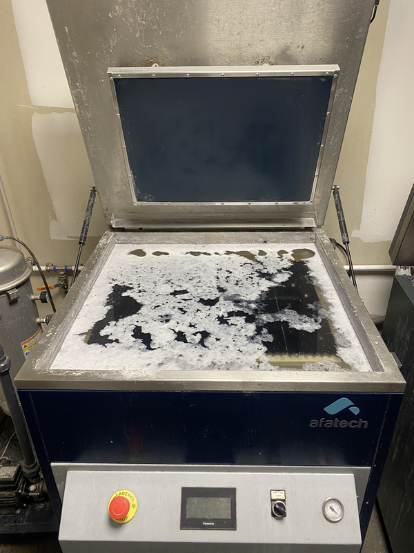 Cette machine sert à développer les plaques photopolymères utilisées en impression. Les plaques y sont immergées pour retirer la matière non exposée à la lumière. Elle permet d’obtenir un cliché propre, prêt à être monté sur la presse d’impression.
