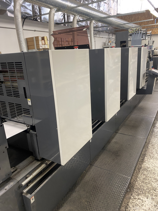 Cette machine est une presse offset, utilisée pour imprimer des documents en grande quantité avec une très haute qualité. Elle fonctionne avec plusieurs unités d’impression qui déposent les couleurs successivement sur le papier grâce à des plaques métalliques. Ce procédé assure une impression rapide, précise et parfaitement régulière.