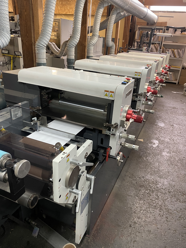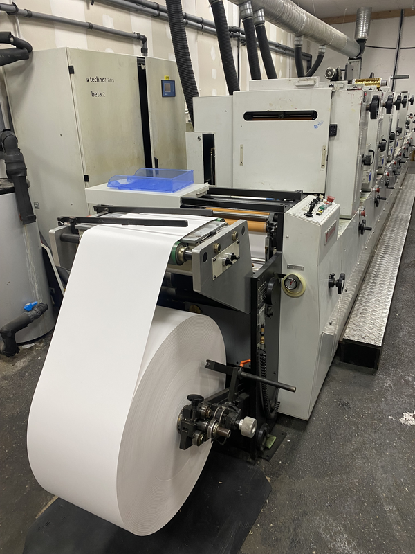 Cette presse imprime en continu sur des rouleaux de papier ou de film. Chaque module dépose une couleur à l’aide d’un cliché cylindrique. La machine permet d’obtenir des étiquettes de haute qualité, avec un séchage rapide entre chaque couleur.